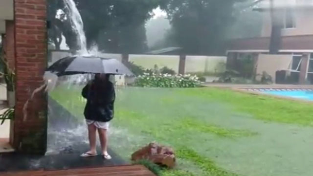 熊孩子暴雨天在户外戏水险遭雷劈